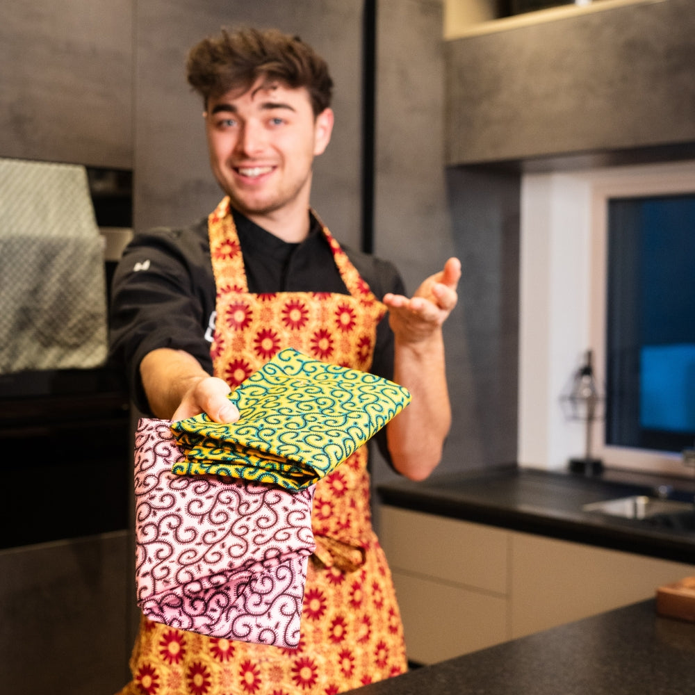 Die Schürzen werden aus regionalen Stoffen Afrikas gefertigt und bringen nachhaltigen Mehrwert in eine der ärmsten Regionen der Welt. Jede Schürze wird in liebevoller Handarbeit gefertigt und kann daher kleine Unregelmäßigkeiten oder Fehler aufweisen. Diese machen jedes Stück zu einem besonderen Unikat und erzählen die Geschichte der traditionellen Handwerkskunst in Ruanda.